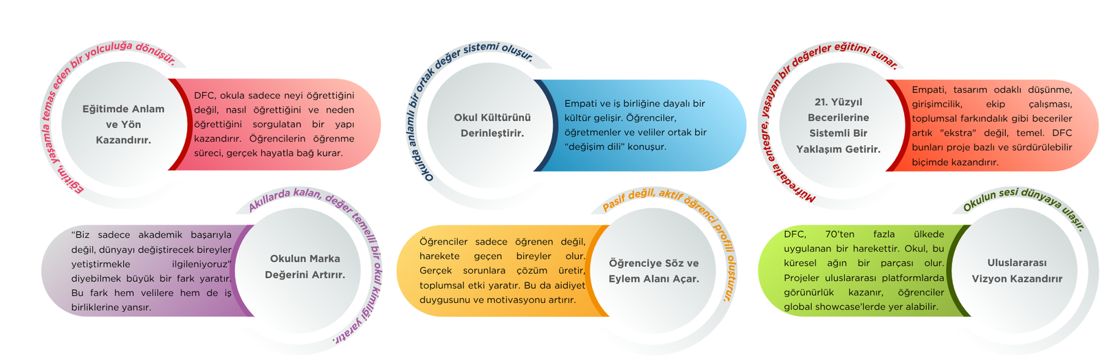 Design for Change (DFC) Okul Akreditasyonu, çocukların değişim yaratma potansiyelini destekleyen; kapsayıcı, yaratıcı ve çözüm odaklı bir öğrenme kültürünü okullara kazandırmak amacıyla geliştirilmiştir. Bu yaklaşım, tasarım odaklı düşünmeyi merkeze alır ve okul kültürü içerisinde sistematik hale getirilir.
